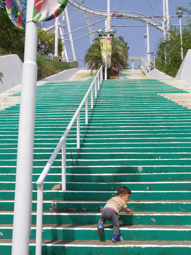 山の上の遊園地だけあって、ジェットコースターから見る景色は抜群。海はもちろん、緑も多いので、自然を感じられるのがポイントです。ただし、階段もすごい。