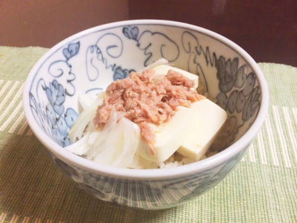 (2)ごはんに、豆腐(写真はスライスしましたがそのままでもOK)ツナ・玉ねぎスライスを乗せる