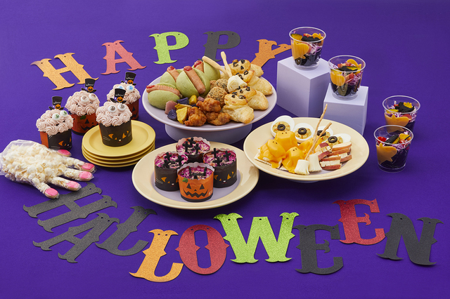 ハロウィーンカップサラダ、モンスターエッグアイ、魔女のほうき仕立てチーズ、指ドッグ、リンゴとクリームチーズのマウスサンド、おばけポテサラ、墓場のグラタン、ハロウィーンミートパイ、イカスミライスコロッケ、カラフルポテトフライ、フライドチキン、骸骨ハンドのポップコーン、ハロウィーンカップケーキ