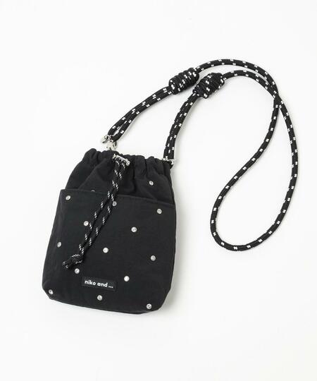 担当者「お手持ちのスマホケースやバッグに付け替え可能なショルダーストラップ付きのミニ巾着バッグ。 ビジューがポイントの大人可愛いデザインです。
