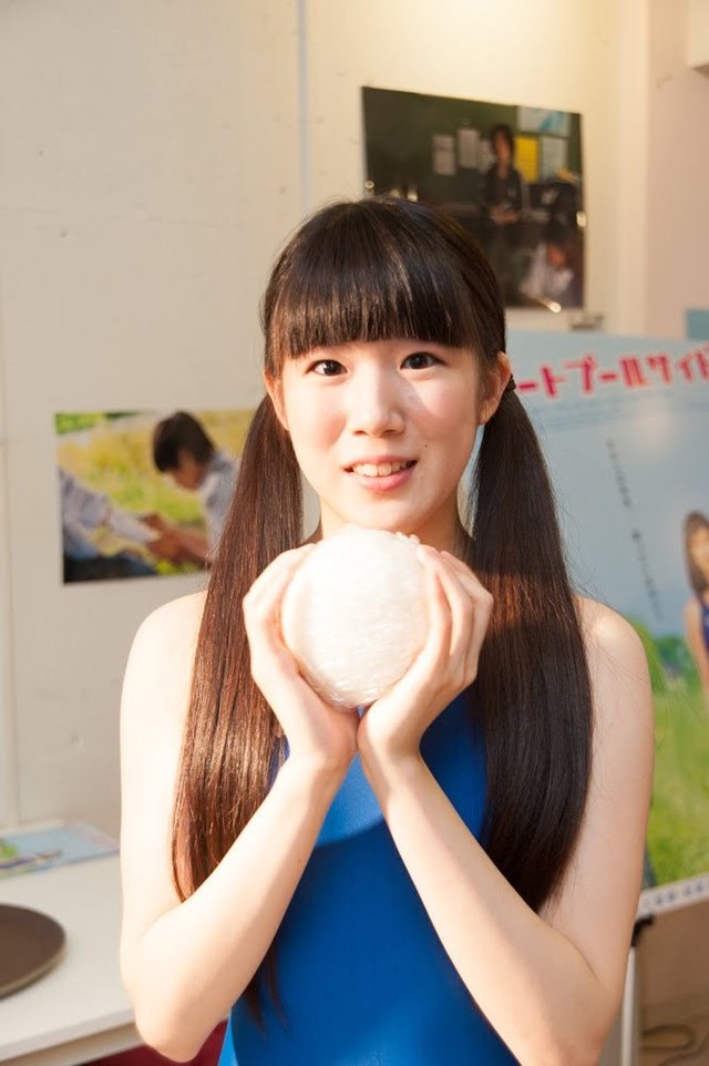 そしてそして、「スク水おにぎり」(700円)。こちら、目の前でウェイトレスさんが握ってくれます。ご飯の量は350gとボリューム満点。顔くらいの大きさですね。
