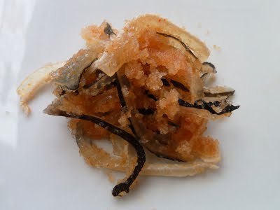 コラーゲンがたっぷりなふぐの皮を明太子で和えた。