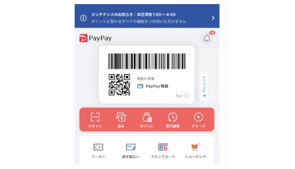 PayPayは、8月20日深夜1~4時にポイントシステムをメンテナンスする。期間中、ポイントにかかわるすべての機能が利用できない。