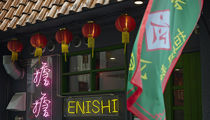 JR灘駅近くの『担担麺専門 ENISHI 総本店』。ランチタイムは混み合うので、すこし時間をずらして来店を。