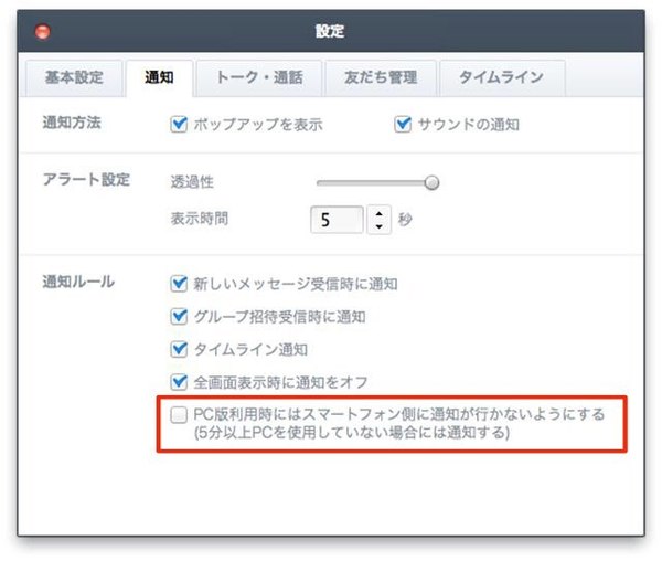 また、パソコンで監視をする際には「設定」の「通知」でPC版利用時にはスマホに通知が行かないようにする」のチェックを外すことを忘れないようにしましょう。ここにチェックが入ったまま利用してしまうと、パソコン版LINEで子どものアカウントにログインしている最中は子どものスマホに着信通知が行かなくなってしまいます。