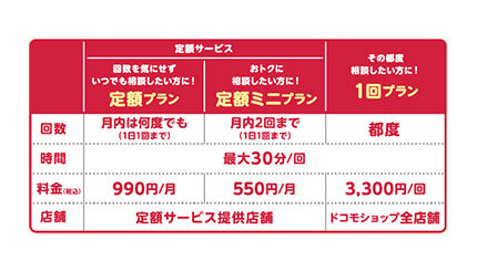 料金は、最大月2回利用可能な「定額ミニプラン」が月額550円、月内何度でも利用可能な「定額プラン」が月額990円、「1回プラン」が3300円。各プランとも提供時間は1回最大30分(1日の最大利用回数は1回)。なお、定額プラン、定額ミニプランは一部対象外の店舗がある。また、提供中の「アプリ設定サポート」は9月1日で終了する。