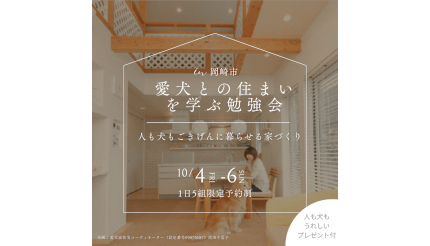 浅井住宅は10月4~6日の期間、イベント「愛犬と暮らす家、勉強会」を同社の事務所(愛知県岡崎市)にて開催する。参加費は無料で、参加にあたっては事前予約が必要。定員は1日5組で、開催時間は9時~、10時30分~、13時30分~、15時~、16時30分~。