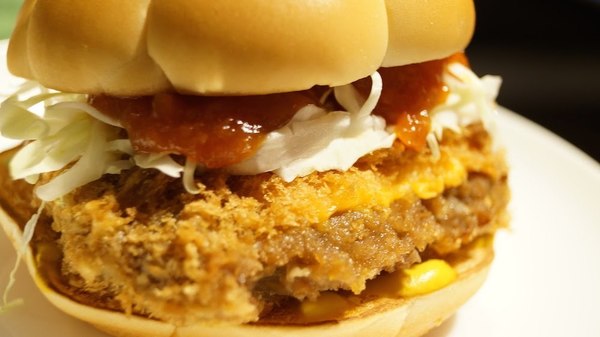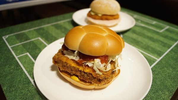 「ジャパンバーガー ビーフメンチ」は肉と衣の間に濃厚なチーズを入れた特製メンチカツを、サッカーボールをイメージしたバンズで挟み込んだ商品。 厚みのあるメンチカツはとてもジューシーで胃袋にガツンとくるボリューミーなハンバーガーとなっています。
