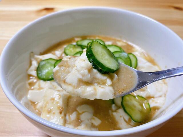 作り方も簡単で、冷や汁のスープを冷蔵庫で冷やし、ご飯、豆腐、きゅうりを準備してかけるだけ。