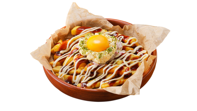 ポテトにオリジナルてりやきソースとマヨネーズを加え、卵黄とたまごサラダをトッピングした「月見てりたまマヨポテト」。お酒にもぴったりのサイドメニューです。