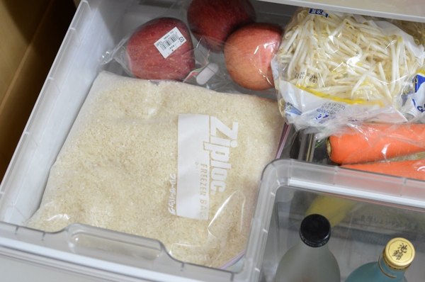 でも、最も効果的なのが、冷蔵庫。お米の虫は低温下では活動・繁殖できないため、夏の間だけでも冷蔵庫に収納しておきましょう。この際は透明なタッパーなどを使うと中の状態が確認できて便利です。個人的にはかさばらずに密閉性も高いジップロックの利用をオススメしますよ。タッパーと違って、自由に形変わるので、限られた冷蔵庫の空間を有効活用することができます。