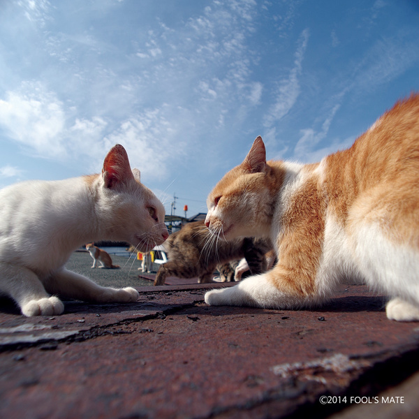 魚が釣れる港にはもちろん多く集まっているし、塀の上にも猫、物陰を覗くと猫、物干しの下にも猫、道を歩いてくるのも猫、草むらにも猫。ここでは目が合う動物はきっと猫です。