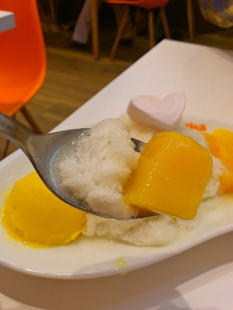 ハート型のマシュマロがキュートです♪ほわっほわのミルク氷と、とろける甘~いマンゴーが合わさって、口にいれたとたんになくなっていくから驚き。特有の嫌な臭みもありません。