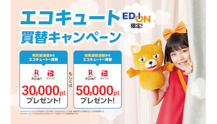 今回のキャンペーンでは、対象のエコキュートをエディオンで購入し、必要書類などを中部電力ミライズに提出した人に特典を進呈する。特典は、電気給湯器(エコキュート・電気温水器)からの買い替えの場合、楽天ポイント3万ポイントまたはPayPayポイント3万ポイント。他熱源給湯器(ガス・石油など)からの買い替えの場合は、楽天ポイント5万ポイントまたはPayPayポイント5万ポイントとなる。なお、PayPayポイントは、PayPayギフトカードで提供する。PayPayポイント(出金・譲渡不可)に交換することで利用できる。