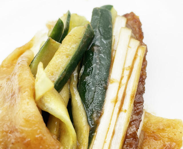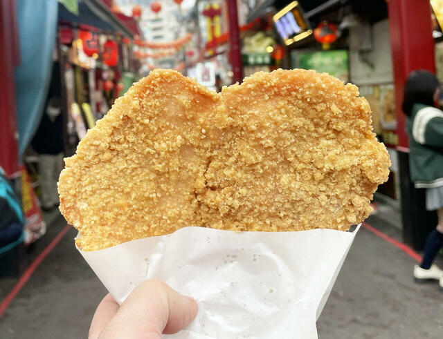 衣の独特の風合いのパンチが強く、中の鳥ムネ肉のほうが脇役のようにも感じる一品ですが、これがなかなか癖になる味。ビール片手に散策するお父さんの良いおつまみにもなりそうです。