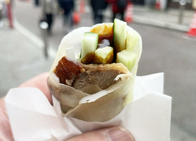 そしていただいたのが「北京ダック」。高級料理の「北京ダック」を小売りにしたような小吃ですが、これがまた美味。特に蒸し暑い季節の食べ歩きには持ってこいで、「肉まん・あんまんはちょっと重いんだよなぁ」なんていう人にもオススメ。