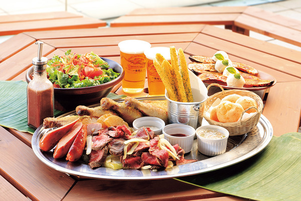 会場は大手町駅に直結する東京サンケイビルの4階。開放的なテラスで都会の夜景を眺めながらいただくのはブラジルプレートセット(3990円)。サラダ、ソーセージ、ガレットなどの食事メニューに加え、焼きバナナとアイスクリームがセットになったお得なプランをぜひ。