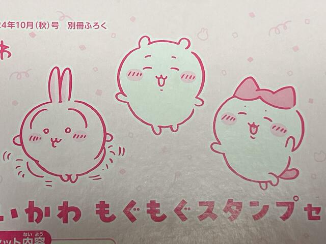 2024年8月30日(金)に発売された『おえかきひめ 2024年10月号』には、「ちいかわもぐもぐスタンプセット」が付録としてついてきます!