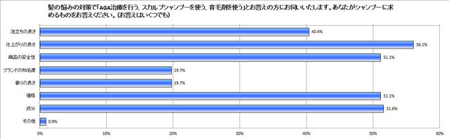 そんなスカルプシャンプーのほか「育毛剤を使う、AGA治療を行う」と回答した人に、シャンプーに求めるポイントを尋ねてみました。