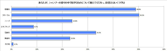 最後にシャンプーの香りについて気にするかどうかを尋ねたところ、「気にする」と答えた人は全体の7割近くにも及びました。ちなみに「好きなシャンプーの香り」は下記のような結果に。