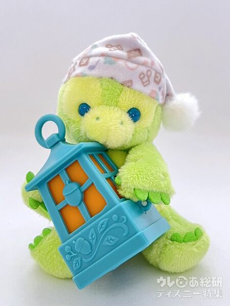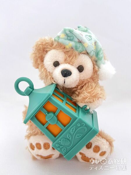 グリーンのランタン、淡いグリーン地にどんぐりや葉っぱ柄のナイトキャップ(以下キャップ)。