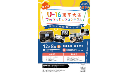 U-16プログラミングコンテスト東京大会実行委員会は12月8日、「第2回U-16プログラミングコンテスト東京大会」を開催する。会場は、都立産業技術高等専門学校・品川キャンパス。大会の模様はYouTubeでの配信も予定している。部門は、競技部門と自由部門の2部門。どちらか1つを選んで応募する。東京都の小学校・中学校・義務教育学校に在籍している児童・生徒※が参加でき、エントリーの締め切りは両部門とも10月31日。