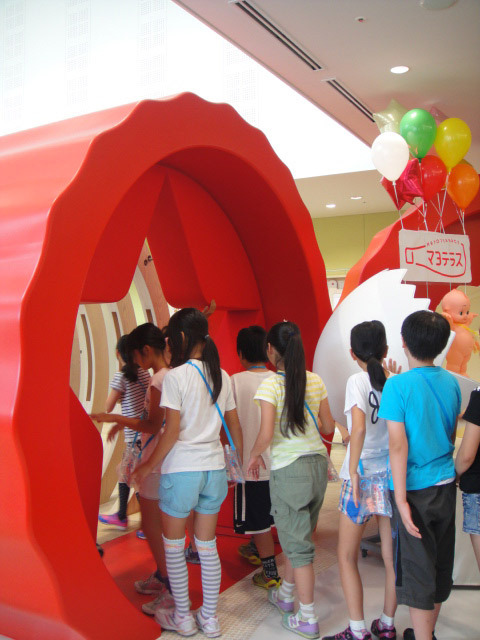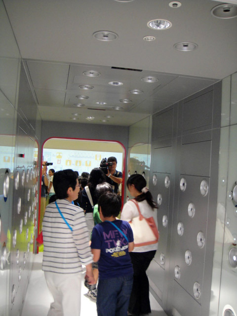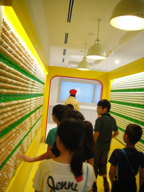 お次はマヨネーズ工場をイメージしたゾーンへと移動。こちら、見た目はおしゃれな普通の通路ですが、ある仕掛けが…。「おおっ! 」と声が上がります。