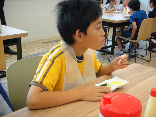 「いただきます」、のごあいさつの後、カットしたきゅうりにマヨネーズをつけて食べます。