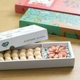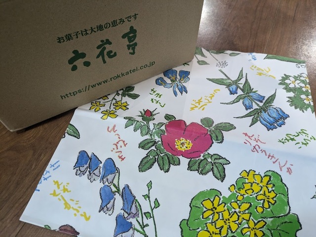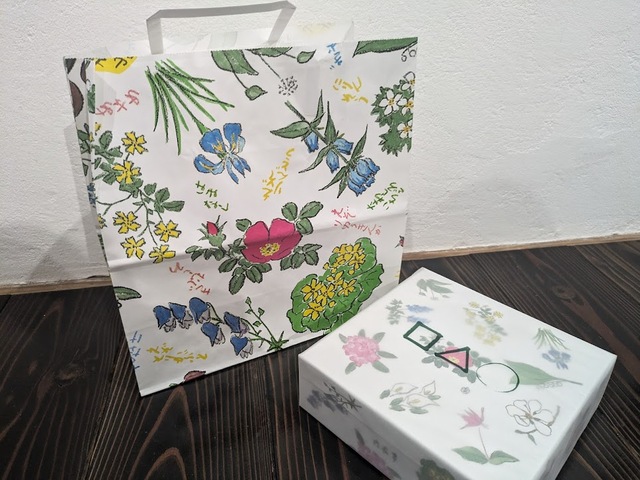 薄紙に包まれた、おなじみのお花のイラストがあしらわれたかわいい箱を開けると、お菓子の名前「〇△□」の由来の説明書きが。裏にはそれぞれのお菓子の説明が書かれています。
