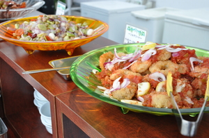 メキシコの「プルポアラ マリネラ(タコのピリ辛トマトマリネ)」(奥)と、 ペルーの「ハレア(イカリングフライのソース掛け)」