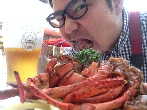 オマール海老越しに自撮り(目の前には団体のお客様が・・・)、ステーキも食べます。美味い(オマール海老の食べ方わからない・・・)。