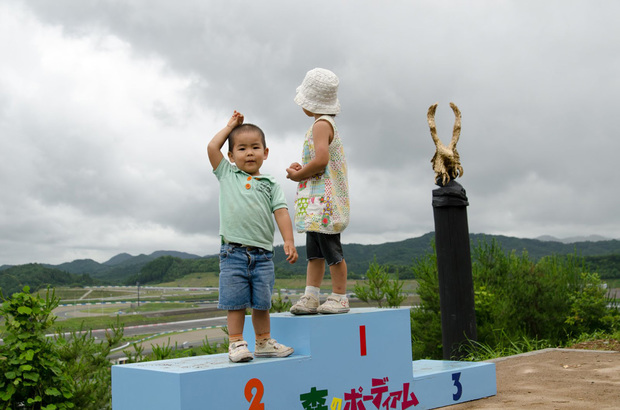 森のポーディアム。遊びの森のさまざまなチャレンジの達成感を味わう。背後にはサーキットの全景が広がり、子どもも興味津々