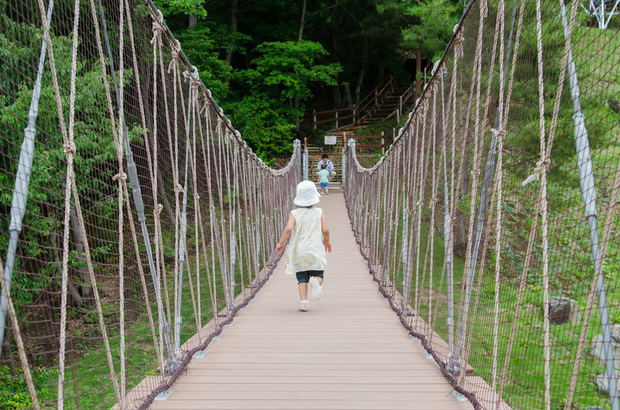 冒険のつりばしを渡ると、いよいよ遊びの森の中へ