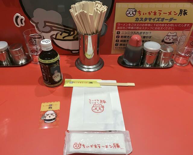 テーブルにはおしぼりや紙エプロン、箸袋などにもちいかわが描かれていてもったいなくて使いづらいー!