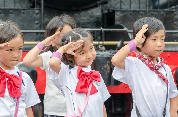 園児たちみんなで、敬礼のポーズをして、記念撮影。こどもたちの表情がかわいらしい。(笑)