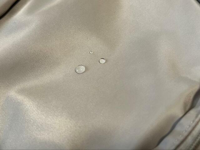 このリュックのさらにおすすめなポイントが、撥水加工が施されている点。実際に水を垂らしてみると、しっかり弾いてくれました!