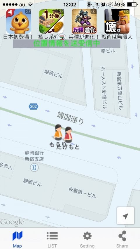 こちらはグループ全員でダウンロードして、同じグループ名を登録すると地図上で相手の位置が分かるというアプリです。