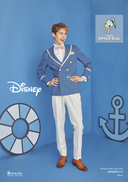 背面のセーラー襟、袖口のトリミングやボタンなど、ドナルドを象徴するマリンイメージを、余すところなく取り入れています。
