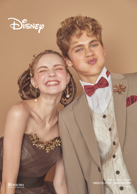 「チップとデール」ファンの花嫁さんにおすすめしたい、グリッターラメが効いた、軽やかなブラウンドレス。