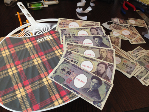取り乱しましたが、このお札を先ほどのうちわに貼り付けていきましょう。