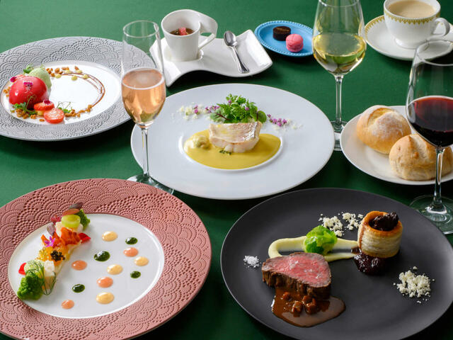 トリュフ香る蝦夷鮑のフランから始まり、甘鯛のヴァプール、国産牛フィレ肉のロースト、クリスマスリースに見立てたデザートのコース。