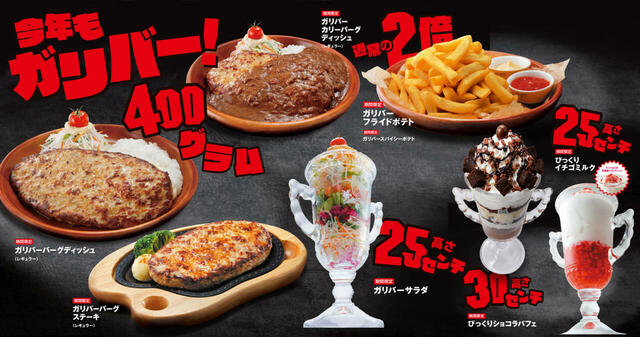 今年で8度目を迎えるびっくりドンキーの毎年恒例「ガリバー」フェア。今年は定番のハンバーグやサラダ、つぶつぶ食感イチゴミルクの他に、新たにカリーバーグディッシュ、ガトーショコラパフェが"ガリバー化"します。