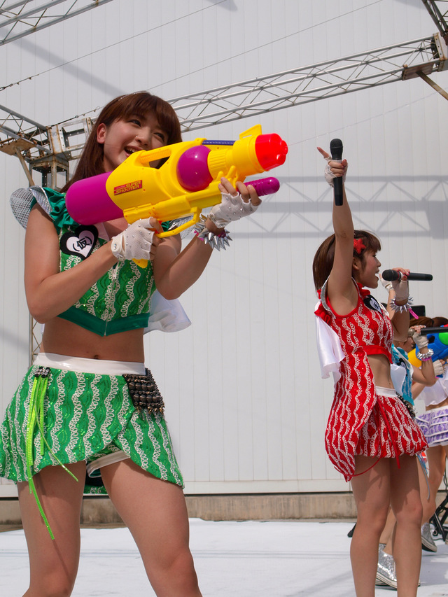 そして、こちらはハロプロエッグ出身者が集まったご存じ「アップアップガールズ(仮)」。現在はハロプロを離れていますが、そのパフォーマンス力は折り紙つきのハイレベル。野外×アプガと言えば、もちろんスプラッシュ!というわけで水鉄砲でガンガンお客さんを撃ちまくってました。この日はかなり気温も高かったので、嬉しいサービスです。