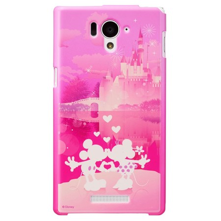 AQUOS、ISAI専用デザイン。湖に浮かぶお城を前に、二人でハートを作るミッキーマウスとミニーマウス。