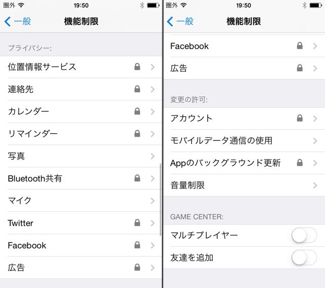 位置情報サービスの利用、連絡先の変更、アカウント情報、SNSの利用、連絡先の参照など、さまざまな設定の可・不可を設定できます。
