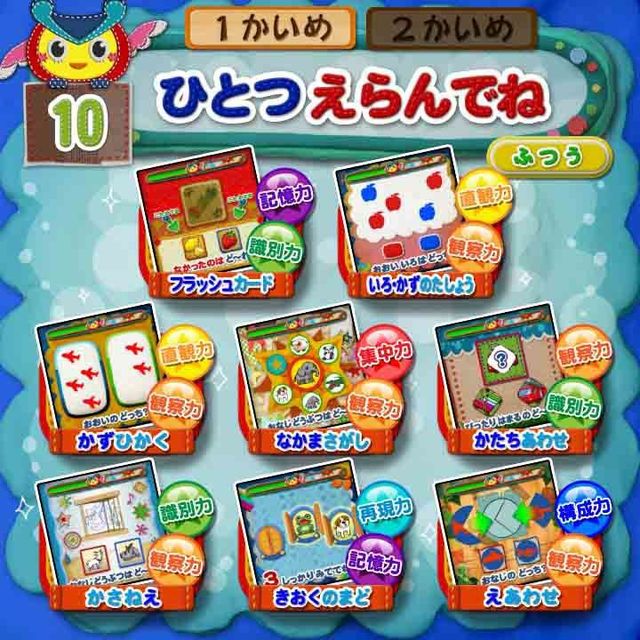 問題は、数種類の絵を見て覚える『フラッシュカード』、左右の絵の数を比較する『かずひかく』、同じ属性をもつ仲間を探す『なかまさがし』、一部が隠された絵をあてる『かたちあわせ』など、全8種類。