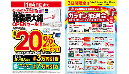 ビックカメラは10月25日から、ビックカメラ新宿西口店(東京都新宿区)に「ユニクロ 新宿本店」と「ダイソー ビックカメラ新宿東口店」がオープンしたことを記念して、新宿地区店舗でのポイントアップキャンペーンと、ビックカメラ新宿西口店におけるユニクロ、GU、ダイソー、およびユニクロ 新宿本店内に出店するPLSTの5社合同によるガラポン抽選会を実施する。