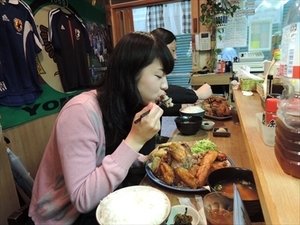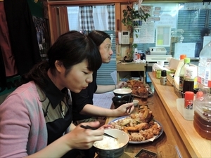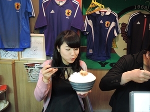クドーはこの時点でギブアップ。30分ほどのチャレンジで唐揚げ10個・手羽先1本・半身揚げ少々・ご飯550グラムという結果。ちょうど、あげ市で提供されている「デカ盛り定丼(980円)」分くらいは食べたとお店の方からのご報告。