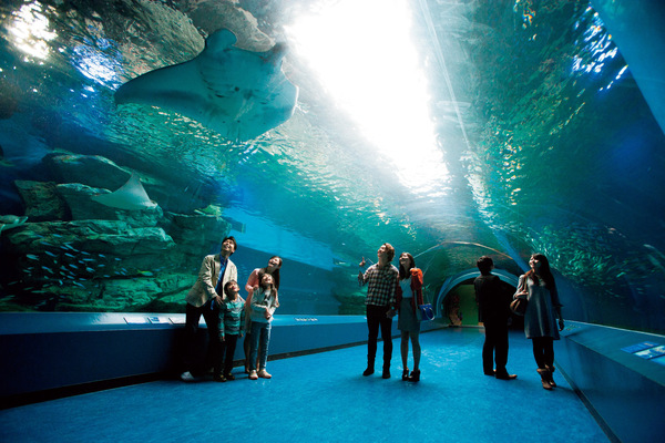 約1万5千点にも及ぶ海の生きものたちが来場者をお出迎え。人気のショーでイルカのダイナミックなジャンプやアシカのコミカルな演技を観賞したり、サメやマンタが泳ぐ長さ約20mの海中トンネルを歩いてみたりと、普段味わえない海の神秘にひたってみては。