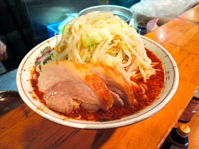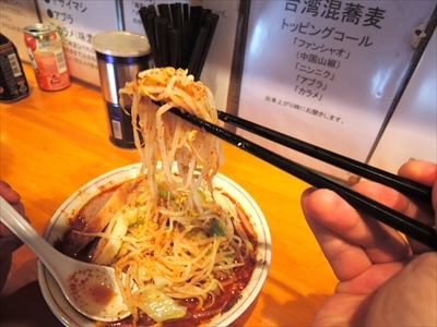 店に入って最初に目に飛び込んできた真っ赤な鍋からタレの中へ大さじ4杯。それをササッと掻き混ぜ、三たび茹であがった麺と野菜が職人の手つきで見事に盛りつけられると、辛麺(しんめん/750円)の完成である。